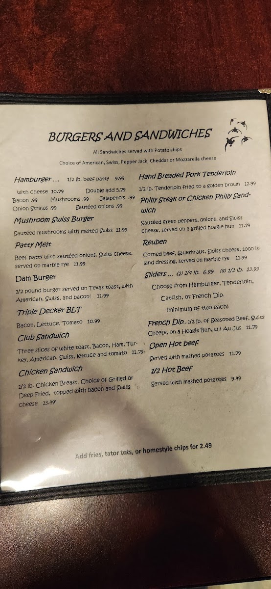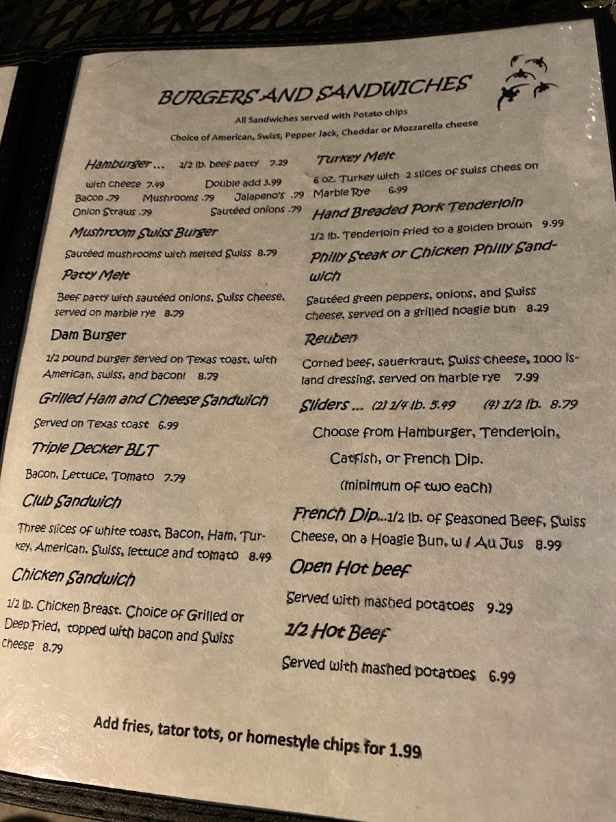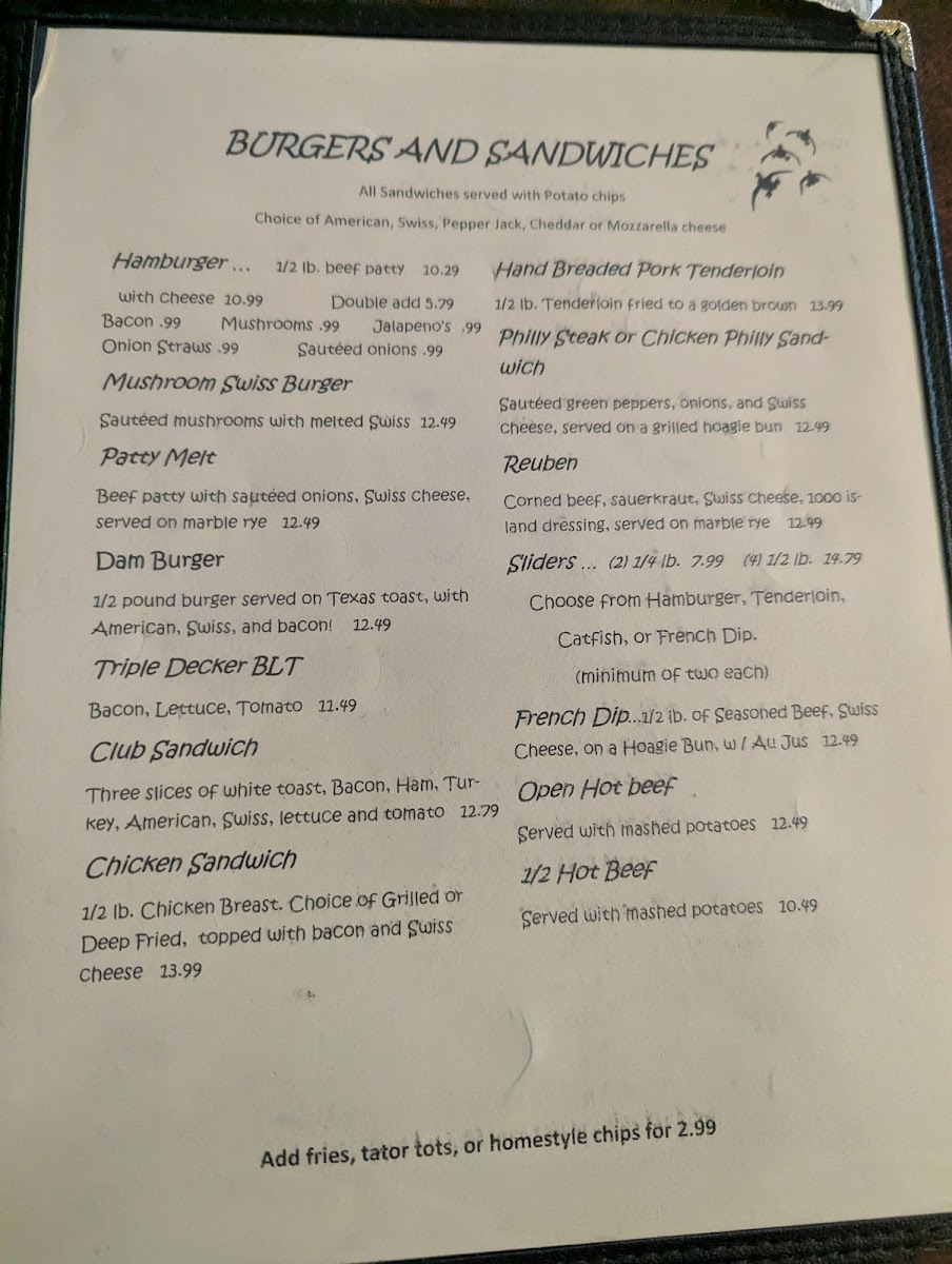 The menu features a variety of casual bites and satisfying dinners, such as crispy fried catfish baskets, hand-breaded tenderloin dinners, and comforting classics like chicken fried chicken or steak. Alongside these, you’ll find flavorful sides like hush puppies, fried green beans, and baked potatoes that complement the main dishes without fuss.